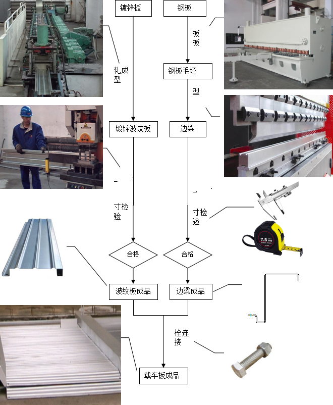 車臺板是通過鍍鋅波紋板和兩側邊梁通過螺栓連接而成,加工工藝如下圖。
